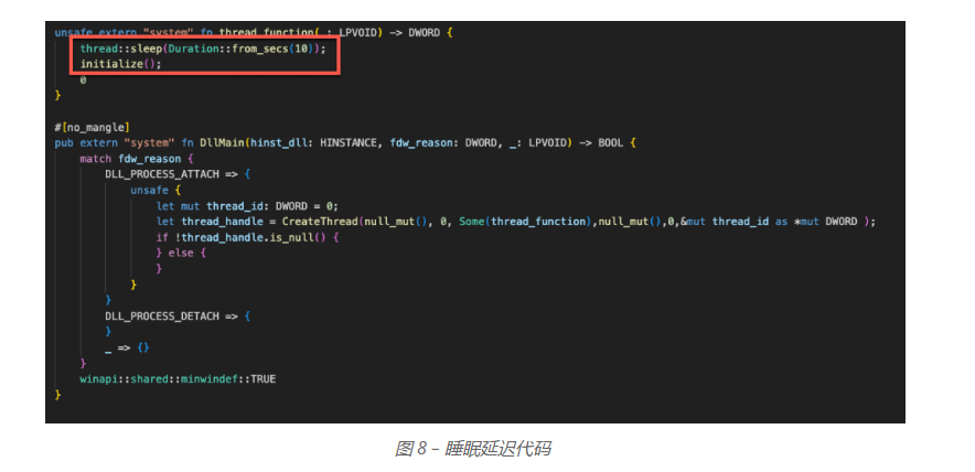 将 DLL 加载到进程后,我们需要一些东西来触发代码。由于我们将函数代理到合法 DLL,因此运行恶意代码的唯一方法是将其放入 DLLMain 函数中。遗憾的是,直接从 DLLMain 运行 Shellcode 可能会引发 DLLhijack 攻击,特别是进程死锁。Microsoft 提供了有关 DLL 最佳实践的文档(如果您有兴趣进一步了解,可以在此处找到)。他们的建议之一是“推迟 DllMain 中可以稍后执行的任何调用”。这句话让我想到创建一个单独的线程,然后将其休眠 10 秒。这确保我们的恶意代码仅在其他所有内容加载到进程中后才运行。通过这样做,我们可以避免被检测到,因为从用户的角度来看,服务或功能不会中断。