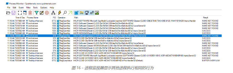 为了扩大搜索范围,我们可以再次使用进程监视器,筛选出以“HKCU”开头的 RegOpenKey 操作,结果为“未找到名称”。通过监控,我们可以发现还有哪些应用程序在 HKCU 中查找 COM 对象,以便我们可以劫持它们。经过几个小时的监控,我们发现许多 Windows 系统原生应用程序都依赖于查询这些 COM 对象来加载 DLL。