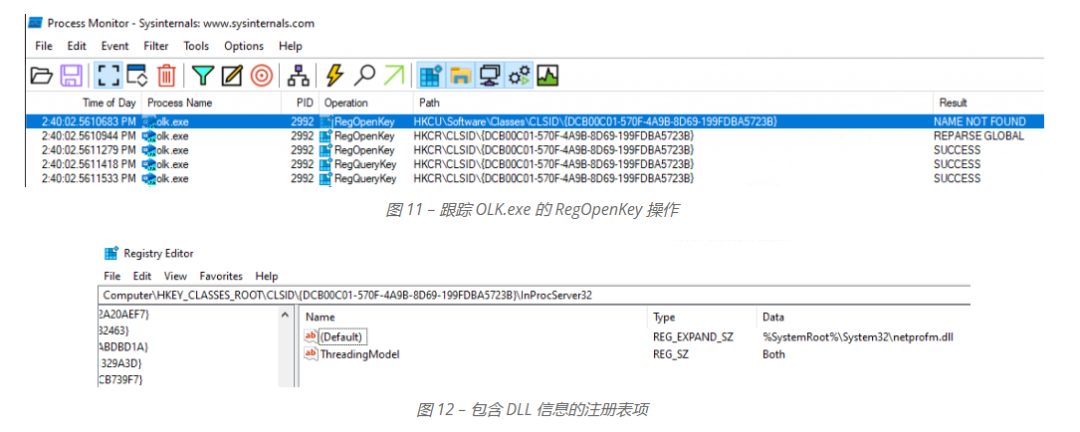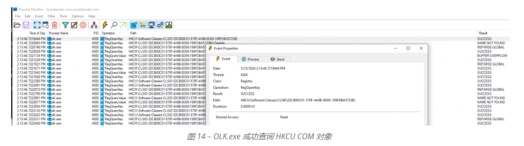 COM 对象(组件对象模型对象)是 Microsoft 框架的重要组成部分,该框架使软件组件能够相互通信,无论它们使用何种语言编写。COM 对象支持进程间通信、版本控制和动态对象创建等功能,这些功能对于在 Windows 操作环境中构建复杂的分布式系统和应用程序至关重要。在本例中,这些 COM 查询用于查找某些系统 DLL 的路径,然后进行加载。这些请求的有趣之处在于,它们首先检查注册表的当前用户 (HKCU) 部分;然而,它们无法找到正确的注册表值,因此会转到注册表中存在这些条目的其他部分。