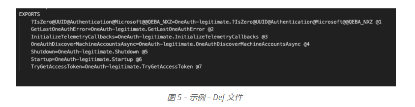 现在,我们已知一个 DLL 会在执行时加载,文件夹权限允许我们向其中写入新的 DLL,并且我们可以重命名该文件夹中的任何 DLL。下一步是创建代理功能。这时,定义文件 (.def) 就派上用场了。定义文件是包含一个或多个模块语句的文本文件,这些语句描述了 DLL 的各种属性。使用 .def 文件,我们可以定义所有导出函数,并将它们映射到包含所请求函数的合法 DLL。因此,我们可以将合法 DLL 重命名为任何我们想要的名称(在下面的示例中,我们在名称后附加 -legitimate),并将我们的 DLL 放在同一文件夹中,这样,当进程加载它时,它会将对下述函数的任何请求代理到对合法 DLL 的请求。