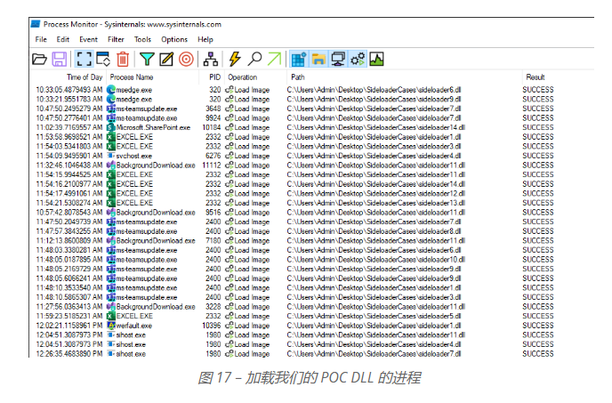 有了这份详尽的 COM 对象 UUID 列表以及上述步骤,我们可以创建许多不同的 POC DLL,并映射到不同的 DLL。通过在企业中通常包含大量应用程序的终端的注册表 HKCU\SOFTWARE\Classes\CLSID\ 部分中部署这些 DLL 和注册表项,我们可以观察到哪些其他应用程序加载了这些 DLL。结果发现,原生 Windows 和其他应用程序的数量甚至更多。我们可以通过监控包含 POC DLL 的文件夹中的任何“加载映像”操作来查看这一点。