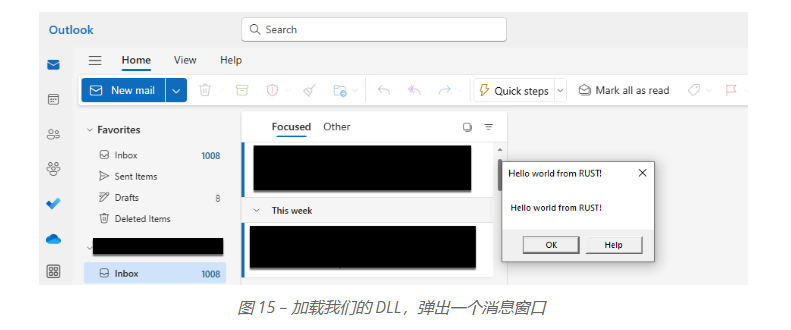 从下图可以看出,这种方法有效,我们能够强制新版 Outlook 加载我们的 DLL。虽然我们只披露了存储在锁定的 WindowsApp 文件夹中的这些新应用程序,但这个问题实际上更为普遍,影响了许多其他应用程序。