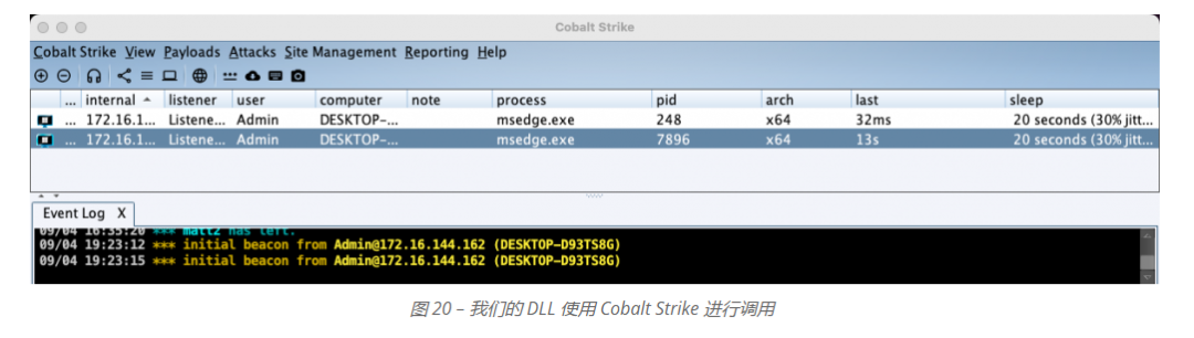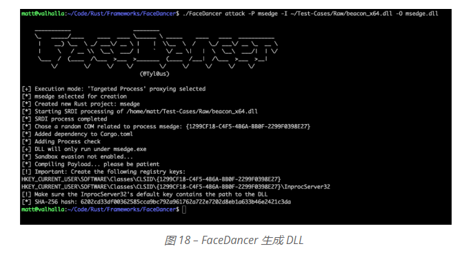 编译和设置这些 DLL 的过程可能有点繁琐,所以我创建了一个名为 FaceDancer 的工具来帮助自动化这个过程。在下面的示例中,我将选择仅针对进程 msedge。我可以使用任意 DLL Payload(在本例中,我使用的是 Cobalt Strike 生成的原生 DLL,没有规避机制),将其输入到这个工具中,它将生成以下内容: