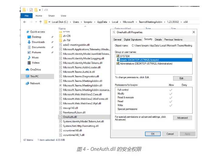 Windows 中的 AppData 文件夹是一个隐藏的系统目录,用于存储特定于应用程序的数据和各个用户帐户的设置。Windows 系统上的每个用户帐户都有自己的 AppData 文件夹,这确保了每个用户的应用程序数据都独立且安全。由于该文件夹专注于用户数据,因此用户本身拥有写入 AppData 中任何内容的权限。这使得它成为托管恶意代码的理想场所,也成为托管进程使用的合法 DLL 的极不安全的地方。如下所示,低权限用户可以写入包含“TeamsMeetingAddin”的文件夹。
