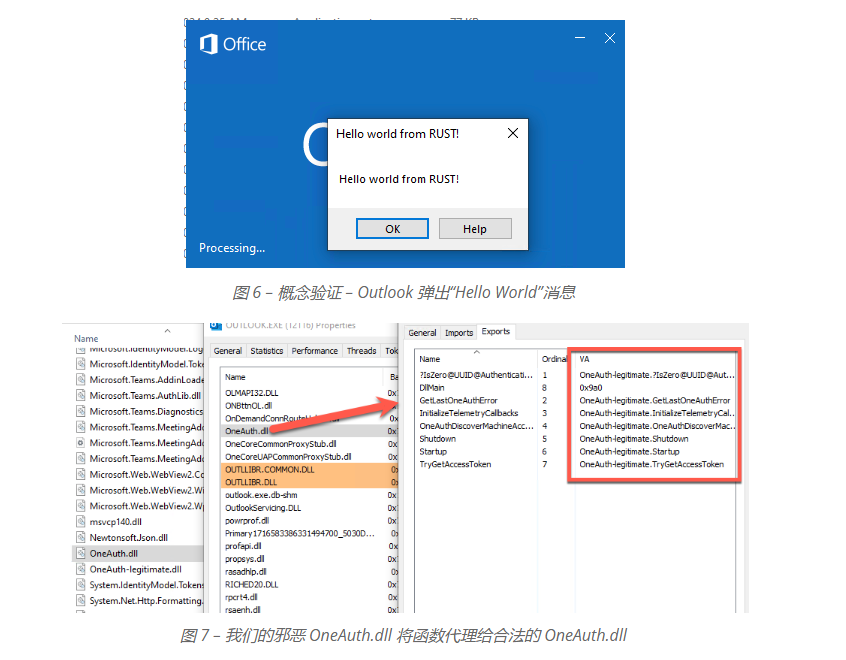 只有一个 DLL 会被加载(不是 OneAuth.dll 和 OneAuth-legitimate/dll),但当我们查看 DLL 的导出函数时,我们可以看到每个代理函数都回调到了 OneAuth-legitmate.dll。在下面的示例中,我们的 OneAuth.dll 只会弹出一个简单的 hello world 语句,显示我们的 DLL 已加载。深入研究后,我们可以看到导出函数中引用了合法的 DLL。