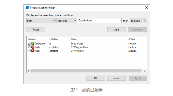 一个有效的工具是进程监视器 (Process Monitor),这是一款适用于 Windows 的免费工具,可以监视并显示实时文件系统、注册表以及进程/线程活动。进程监视器可用于观察应用程序的“加载映像”事件,该事件发生在应用程序加载 DLL 时。通过过滤特定的文件位置,可以识别可能被代理的 DLL。