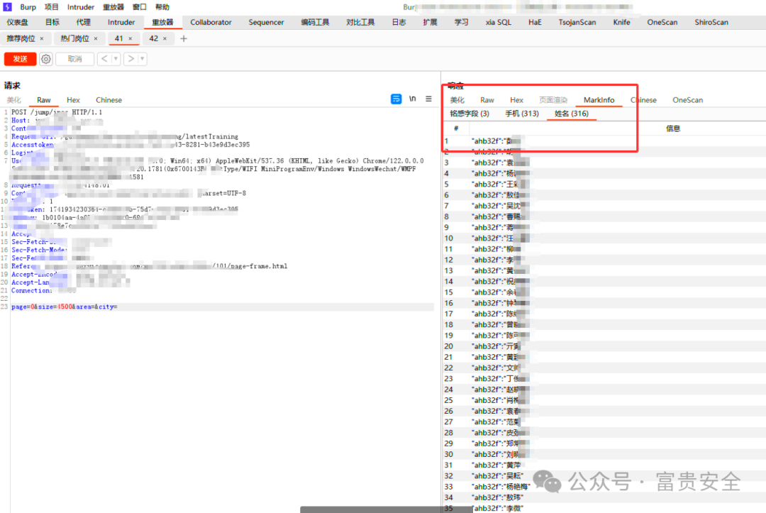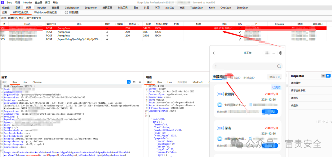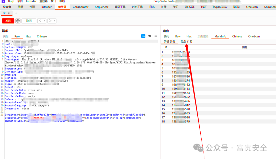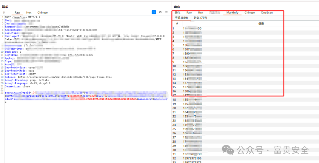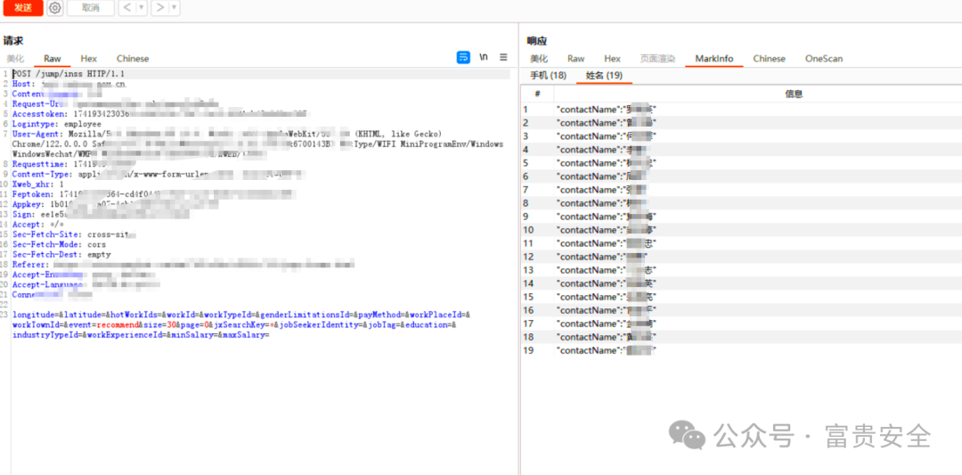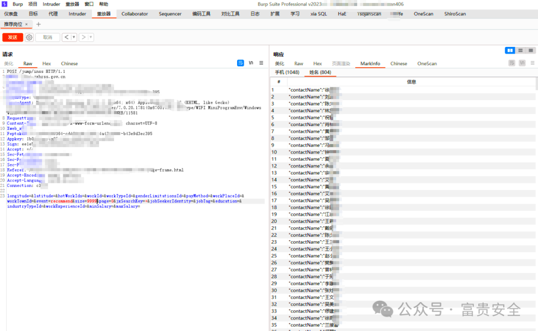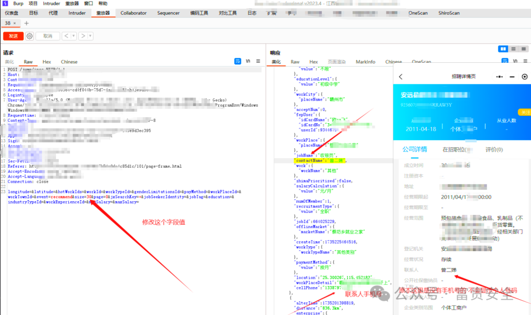 其他功能点均存在此问题,大部分都是页面只能看到企业联系人姓名,打电话联系也是虚拟号码,但是在响应体中确会显示所有的手机号码和姓名,小程序业务也是求职里面包含大量的公司企业,通过响应包缺陷+模糊查询*+size字节+Hae神器匹配整站企业联系人二要素全部泄露,并未全部列出但目测2w+条