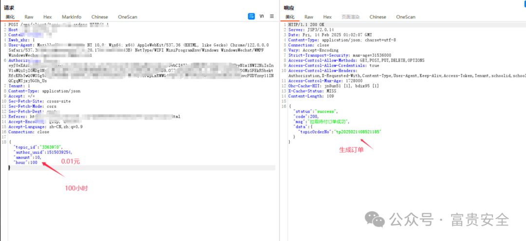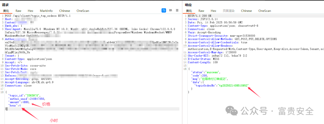正常走发布帖子的流程,记录所有接口 这个接口数据包回显了对应的价格字段 并且没有对应的sing或者加密一类的东西和后端做校验,等于是前端校验价格还有置顶的时间,然后后端就返回了生成订单,那么我们篡改价格并且拉成时间就造成了漏洞问题了 /api/client/topic_top_orders