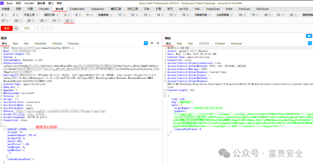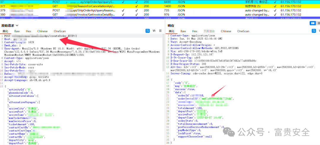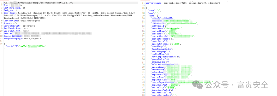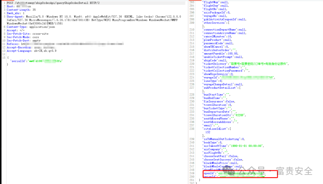 这两个字段都是鉴权字段,有了此字段的就可以跟替换Cookie一样替换别人的身份其他人的,操作此小程序所有增删改查功能点,当前虽然开着Hae但并没有相关的规则字段正则所以匹配不到,真的是细心才能发现,如果这个订单接口可以继续利用遍历的话,再结合返回的这两个字段,整个小程序用户信息全部会被接管,所有乘客三要素包括小程序所有功能点