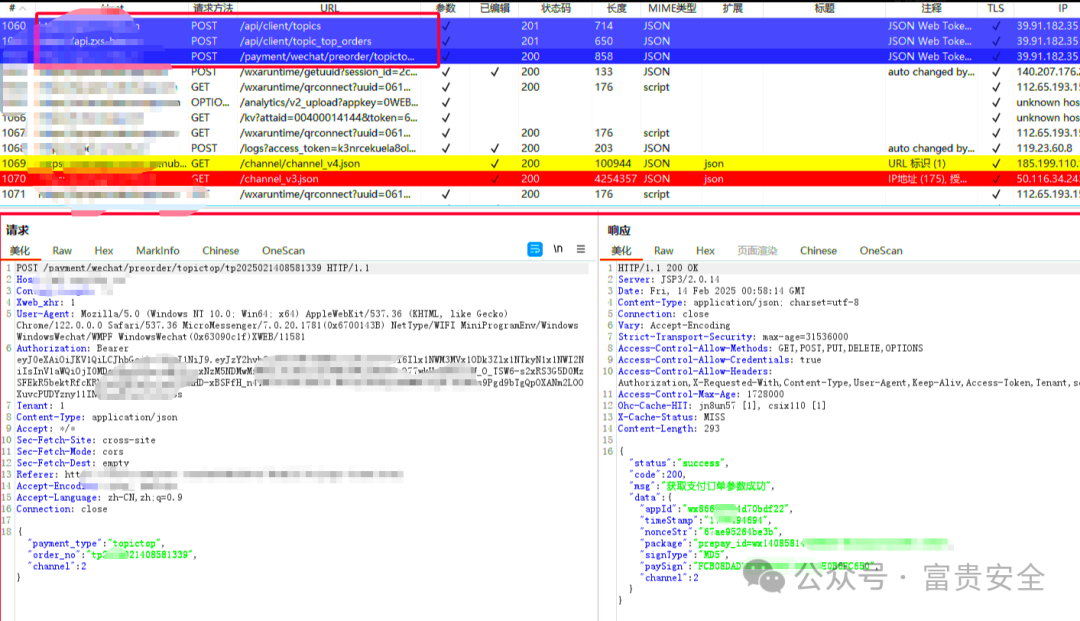 /api/client/topics 帖子内容文字和标签/api/client/topic_top_orders 置顶的价格生成订单号 这里进行篡改payment/wechat/preorder/topictop/tp2025021408581339 请求后端付款