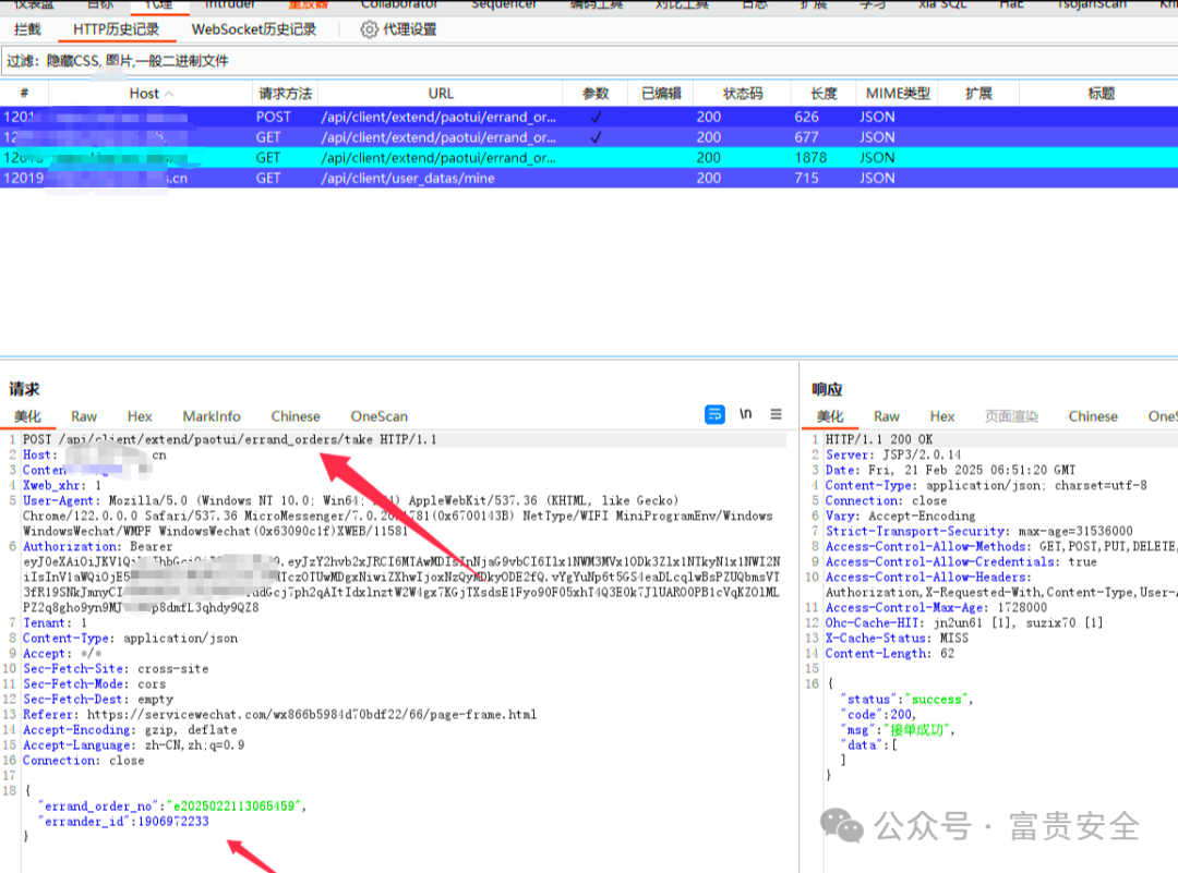 操作这个接口,替换订单号为任意的,跑腿者身份为别人的,可以任意指定谁去接谁的单,经过测试替换别人身份是可行的,订单号以及跑腿者的身份利用其他功能点的输出就可以得到