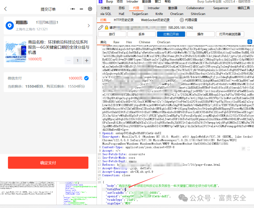 知晓了业务流程后续就是BP抓取生成订单的数据包 api/client/topic_top_orders 进行拦截篡改操作 价格改小就可以完成0元购,点击付费 就会拦截数据包修改价格然后一直放行就行了出现付款的选择 选择二维码支付 扫描付款就行了