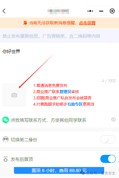 随意输入帖子的文案 然后点击发布后置顶[/api/client/topics/pay_configs] 接口显示出了对应的价格字段还有所持续的时间
