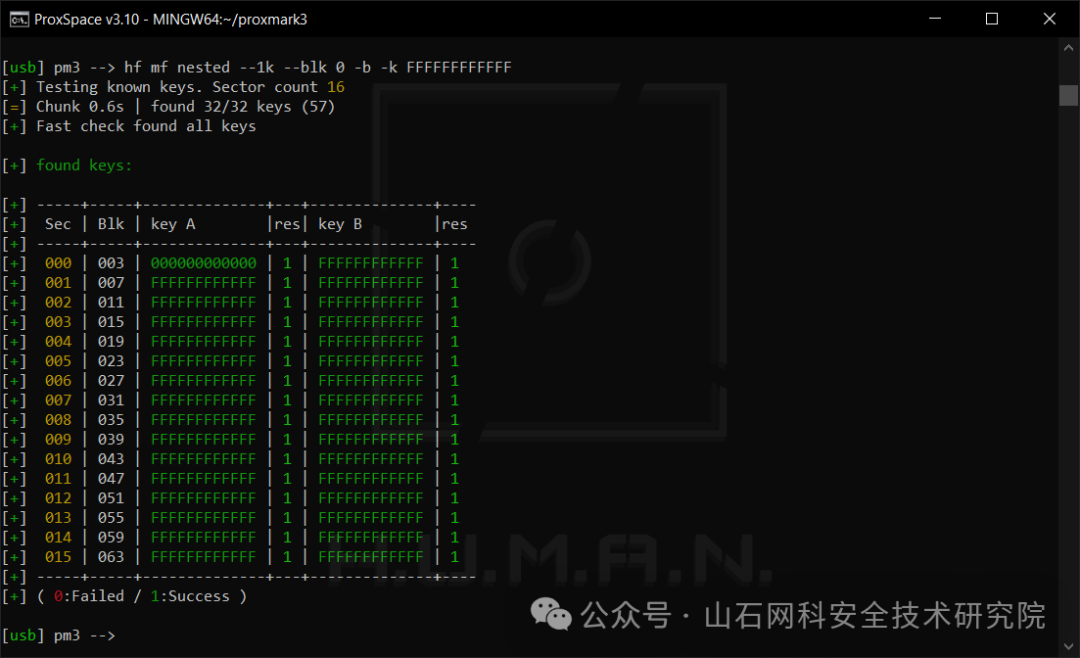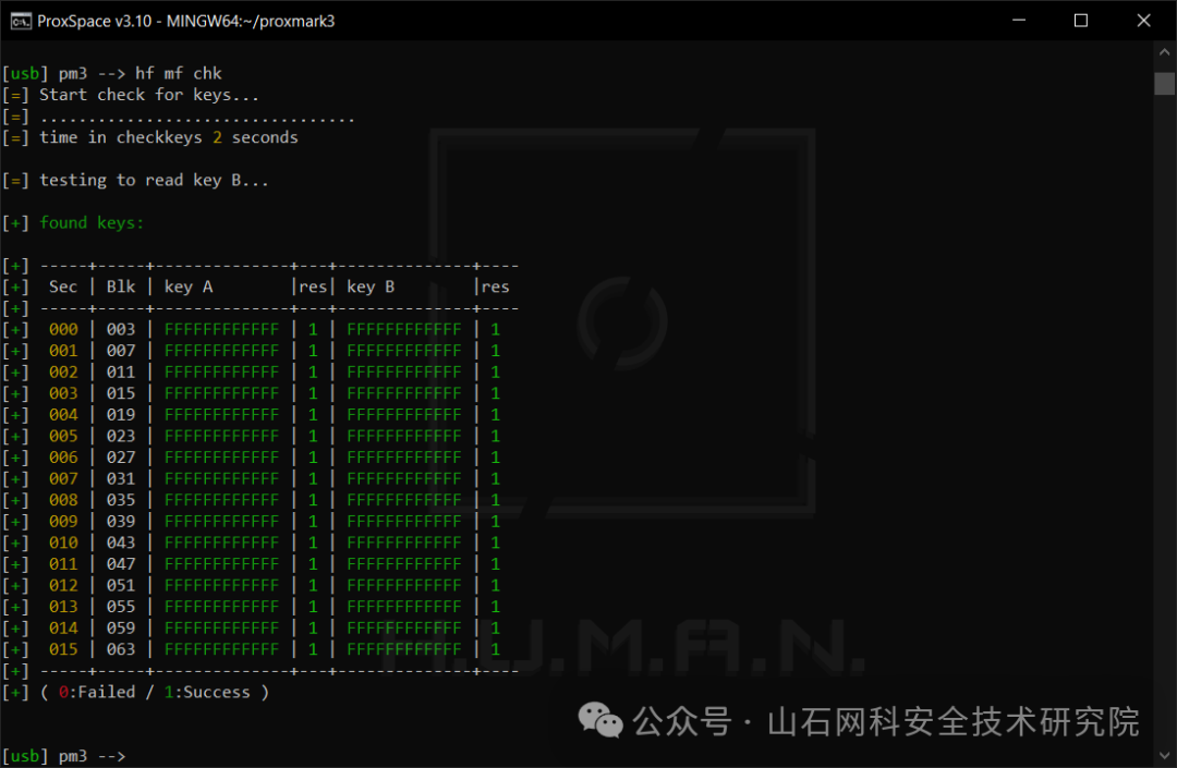命令,使用自定义字典(如Mifare Default Keys[3])默认密钥)进行流行的攻击。