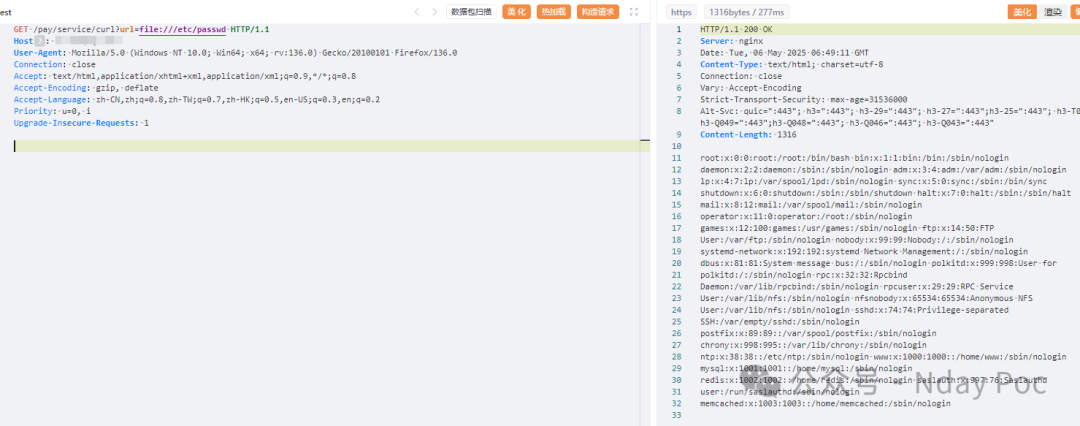 龙腾码支付 /pay/service/curl 接口处存在任意文件读取漏洞,未经身份验证的攻击者可通过该漏洞读取系统重要文件(如数据库配置文件、系统配置文件)、数据库配置文件等等,导致网站处于极度不安全状态。