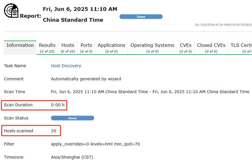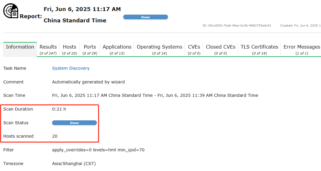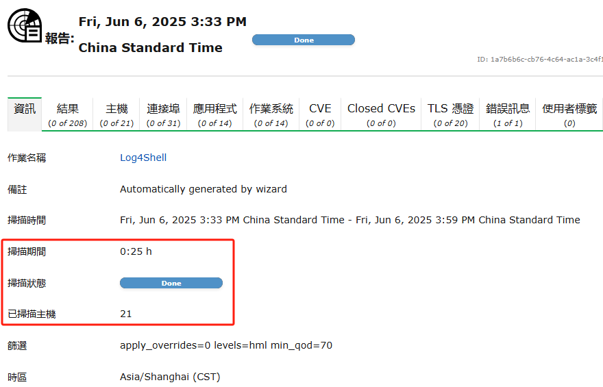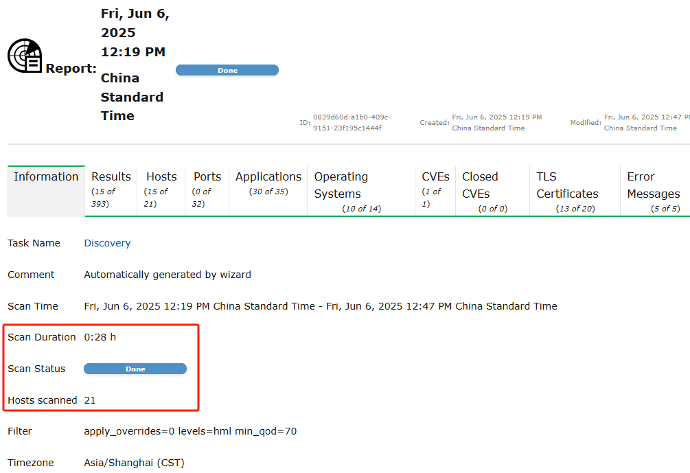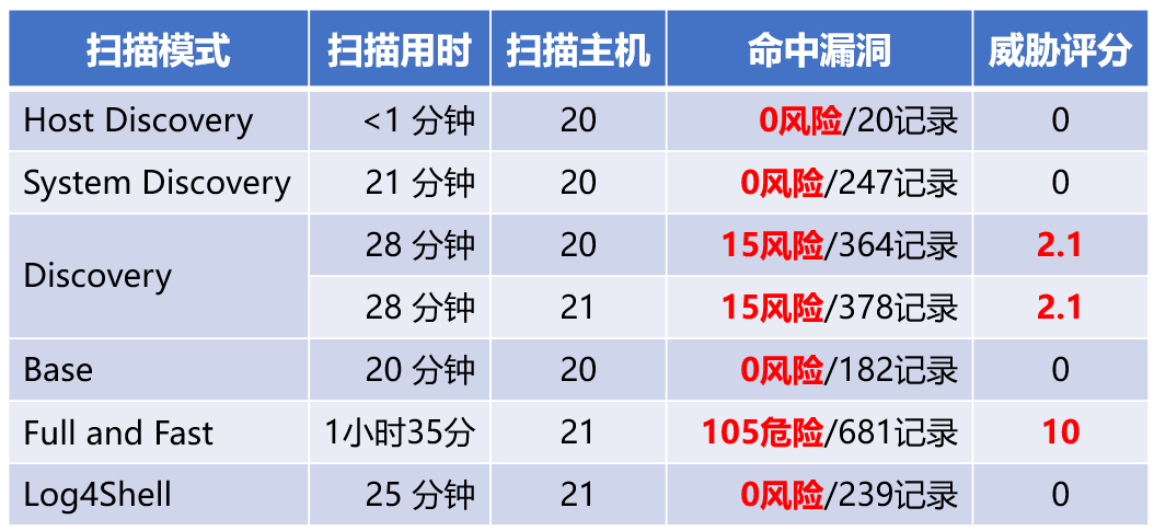 扫描耗时25分钟,扫描了21台主机,未扫描到危险漏洞。