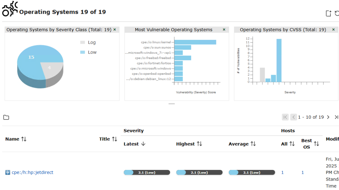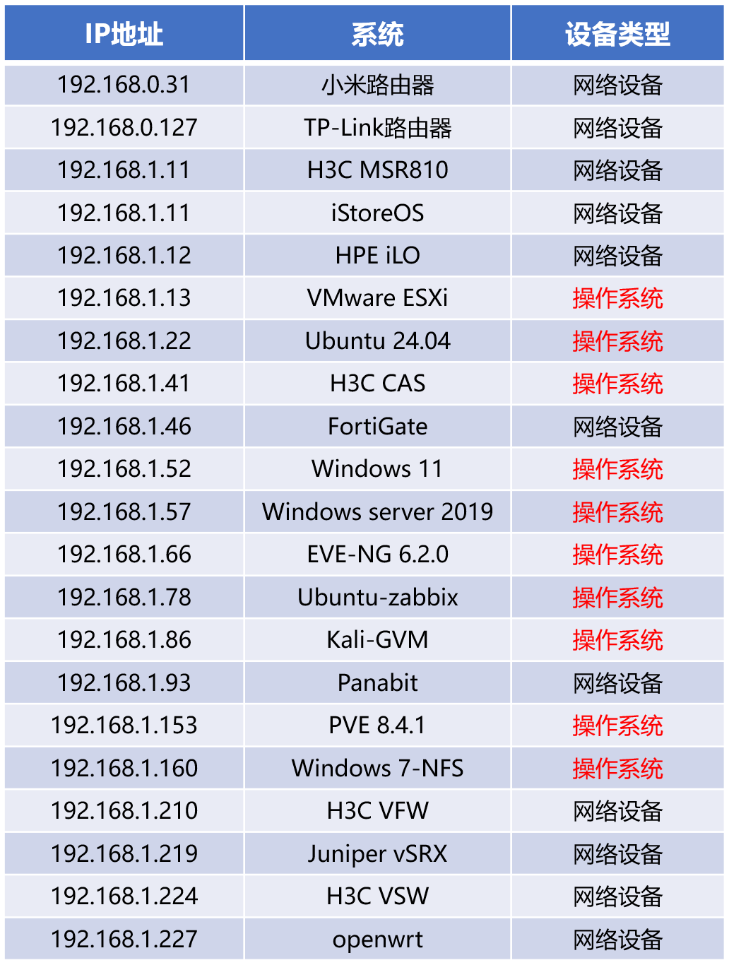 按照设备类型来区分,有11个是网络设备,剩下的10个是操作系统,IP资产统计信息如下表所示: