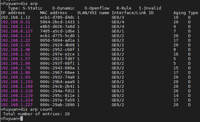 从网关设备MSR810上来看,有20个ARP表项,加上网关自己,一共有21个IP资产。