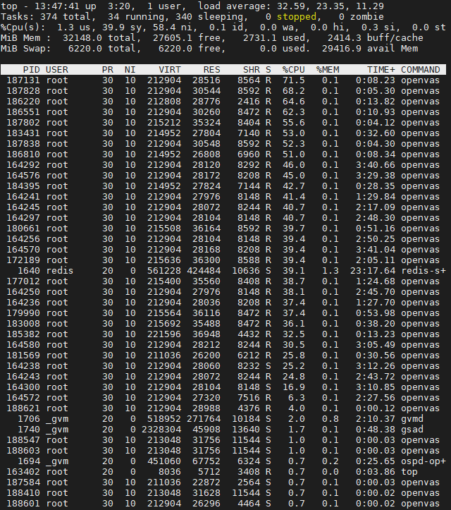 在资源占用上,可以看出Kali版本比Docker版本不知道高出多少倍去了。我们为虚拟机分配了16核CPU资源,在扫描时openvas扫描器用到启动了超过30个进程,不知道的还以为我充钱了。