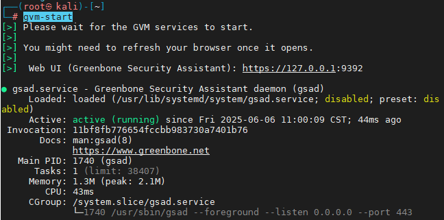 在开始任务任务之前,我们首先要检查服务状态,如果未设置服务器开机自动运行,需要通过命令gvm-start手动启动GVM服务。
