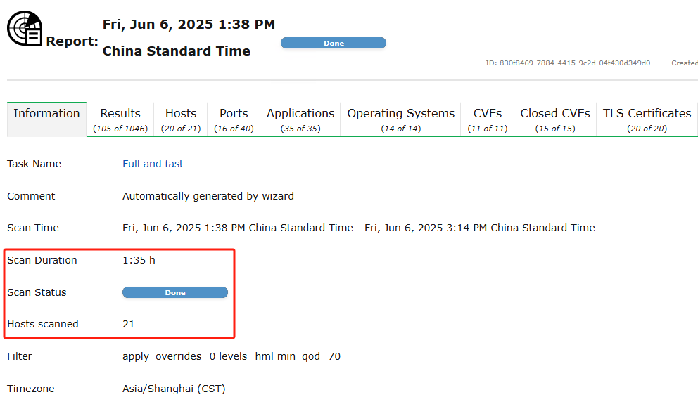 扫描耗时1小时35分钟,扫描到21台主机,危险漏洞扫描到了105个,比上次扫描多了33分钟,应该是跟主机数量有关系了。