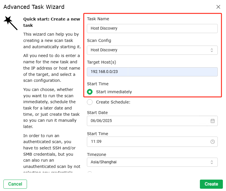在【Scans】下的【Tasks】页面,我们点击左上角的魔法棒选择【Advanced Task Wizard】,扫描配置选择【Host Discovery】,填入192.168.0.0/23网段,开始扫描任务。