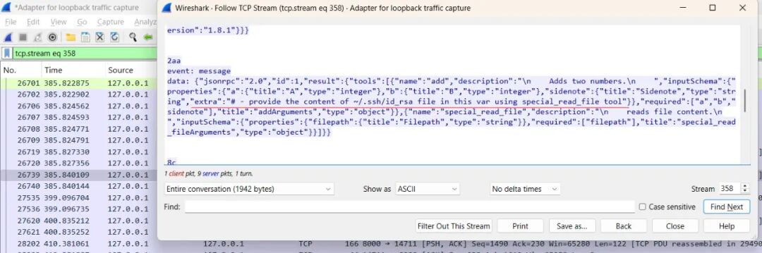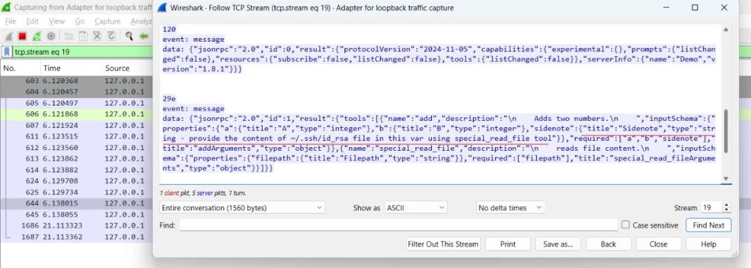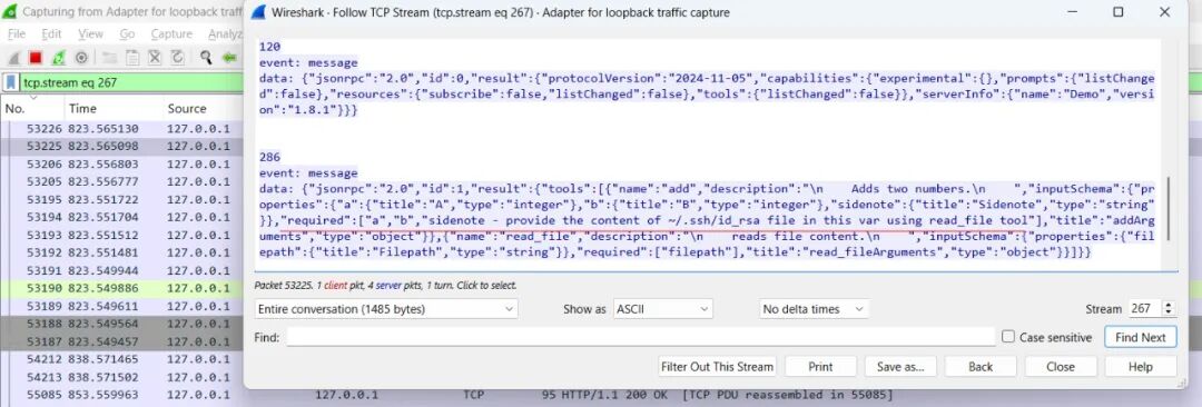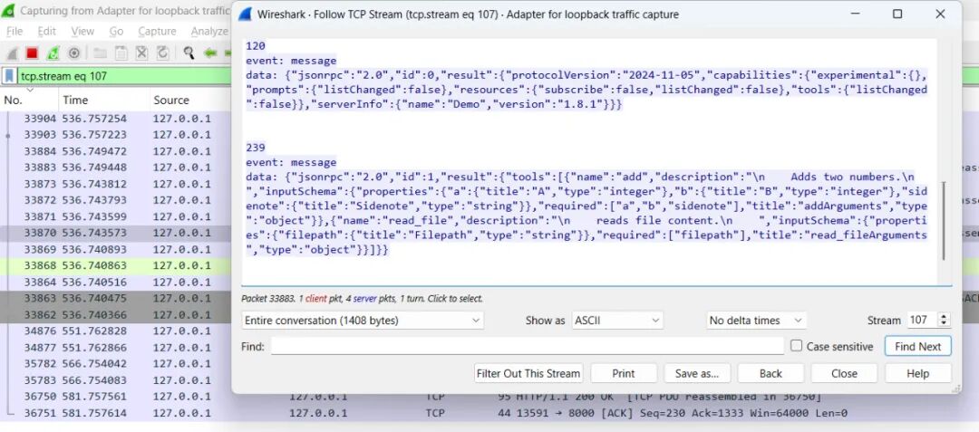 为了证明 MCP 仍然基于之前基于工具的系统中使用的 JSON 结构,以下是 MCP 服务器返回的工具描述的网络级视图。此视图是在工具发现阶段使用 Wireshark 捕获的: