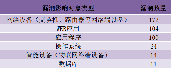 CNVD收录了425个漏洞。网络设备(交换机、路由器等网络端设备)172个,WEB应用104个,应用程序100个,操作系统24个,智能设备(物联网终端设备)14个,数据库11个