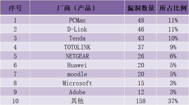 等多家厂商的产品,部分漏洞数量按厂商统计如表3所示。
