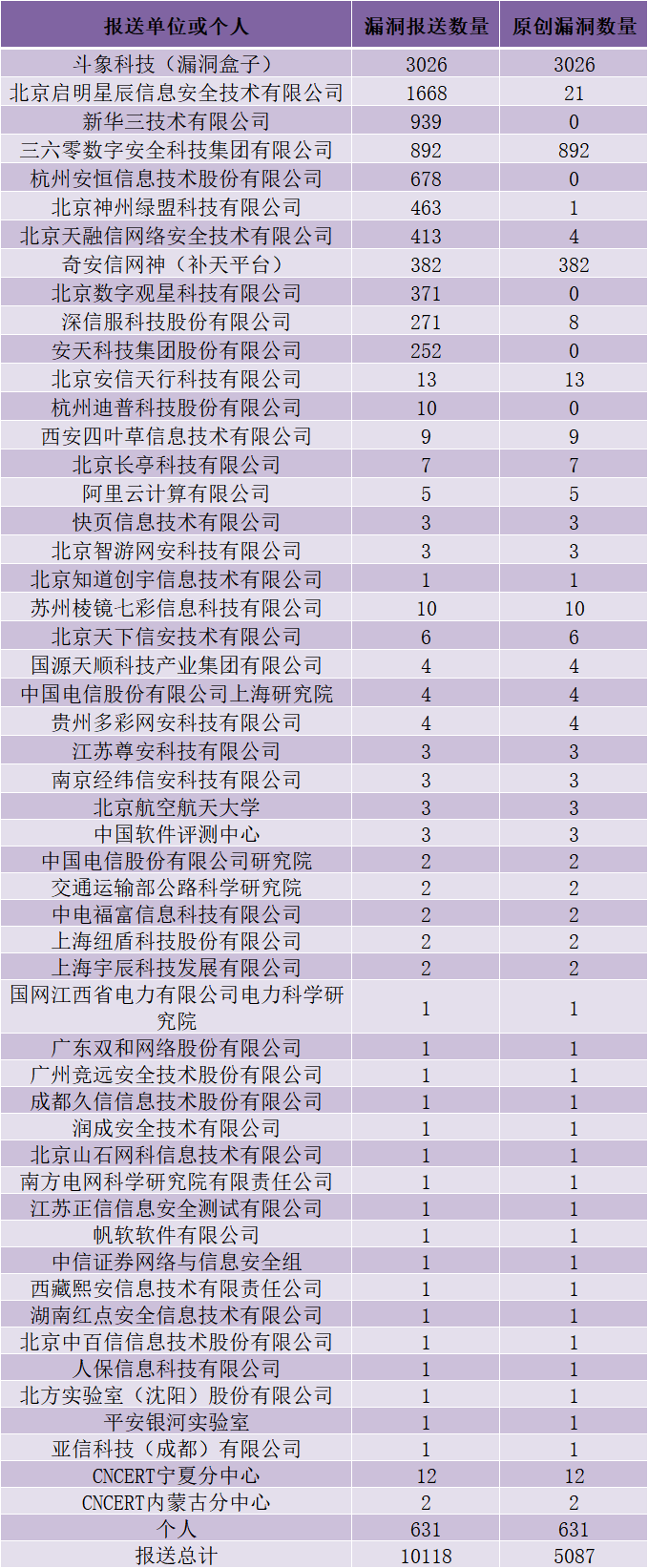 北京启明星辰信息安全技术有限公司、新华三技术有限公司、杭州安恒信息技术股份有限公司、北京神州绿盟科技有限公司、北京天融信网络安全技术有限公司等单位报送公开收集的漏洞数量较多。苏州棱镜七彩信息科技有限公司、北京天下信安技术有限公司、国源天顺科技产业集团有限公司、中国电信股份有限公司上海研究院、贵州多彩网安科技有限公司、江苏尊安科技有限公司、南京经纬信安科技有限公司、北京航空航天大学、中国软件评测中心、中国电信股份有限公司研究院、交通运输部公路科学研究院、中电福富信息科技有限公司、上海纽盾科技股份有限公司、上海宇辰科技发展有限公司、国网江西省电力有限公司电力科学研究院、广东双和网络股份有限公司、广州竞远安全技术股份有限公司、成都久信信息技术股份有限公司、润成安全技术有限公司、北京山石网科信息技术有限公司、南方电网科学研究院有限责任公司、江苏正信信息安全测试有限公司、帆软软件有限公司、中信证券网络与信息安全组、西藏熙安信息技术有限责任公司、湖南红点安全信息技术有限公司、北京中百信信息技术股份有限公司、人保信息科技有限公司、北方实验室(沈阳)股份有限公司、平安银河实验室、亚信科技(成都)有限公司及其他个人白帽子向CNVD提交了5087个以事件型漏洞为主的原创漏洞,其中包括斗象科技(漏洞盒子)、三六零数字安全科技集团有限公司和奇安信网神(补天平台)向CNVD共享的白帽子报送4300条原创漏洞信息