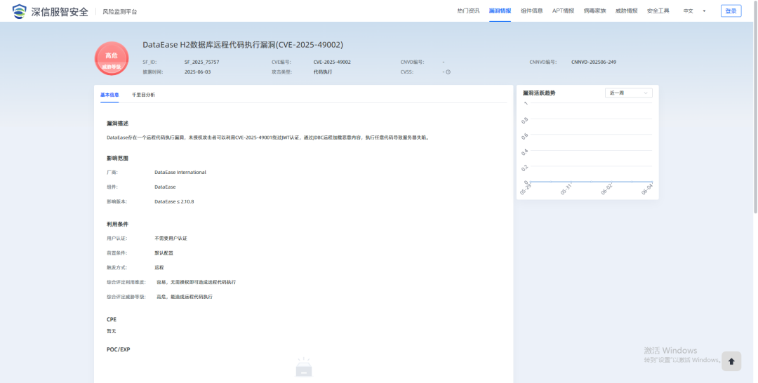 支持对DataEase H2数据库远程代码执行漏洞(CVE-2025-49002)的主动检测,可批量快速检出业务场景中是否存在漏洞风险