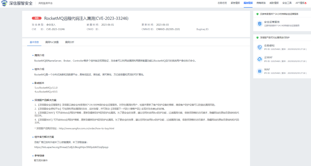 2023 年 6 月 3 日,深信服安全团队监测到一则 RocketMQ 组件存在远程命令注入漏洞的信息,漏洞编号:CVE-2023-33246,漏洞威胁等级:高危。