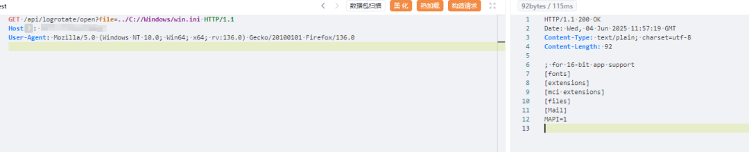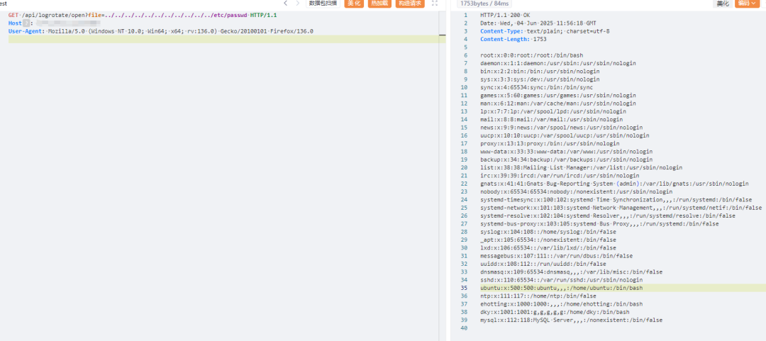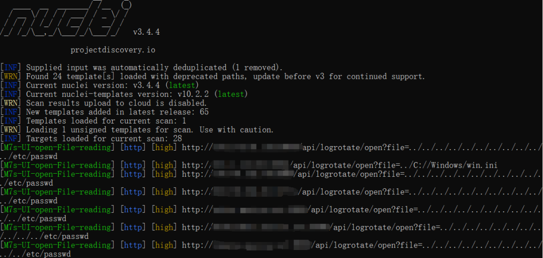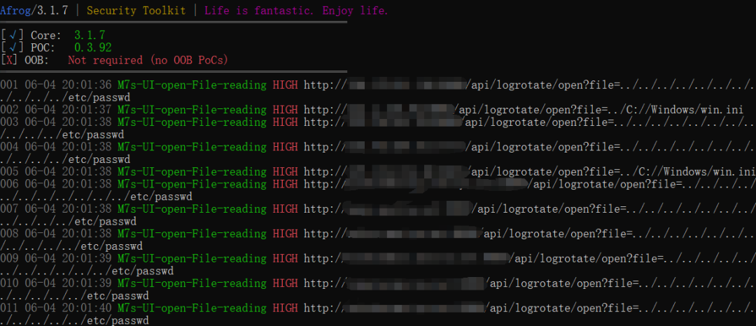 M7s UI /api/logrotate/open 接口处任意文件读取漏洞,未经身份验证攻击者可通过该漏洞读取系统重要文件(如数据库配置文件、系统配置文件)、数据库配置文件等等,导致网站处于极度不安全状态。