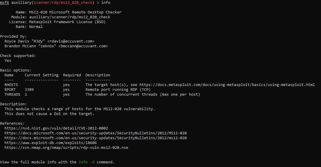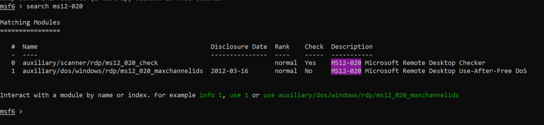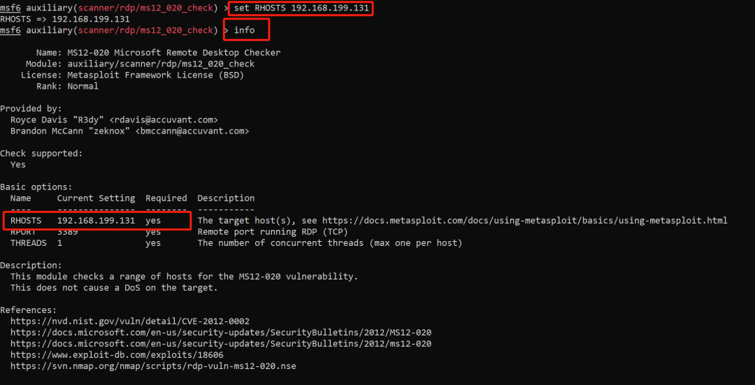 (1)use auxiliary/scanner/rdp/ms12_020_check