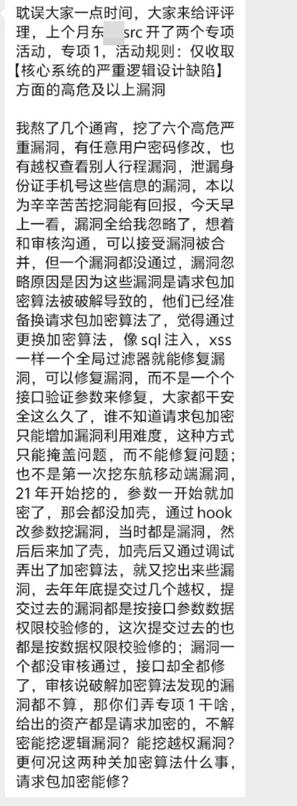 1.熬夜通宵挖漏洞,你是把SRC当你家开是吧,在没有明确清楚回报率的情况下去熬夜挖漏洞,用自己的宝贵的身体健康做牺牲,现在来群里哭,就那点奖金还不够你去医院看病,纯SB行为。