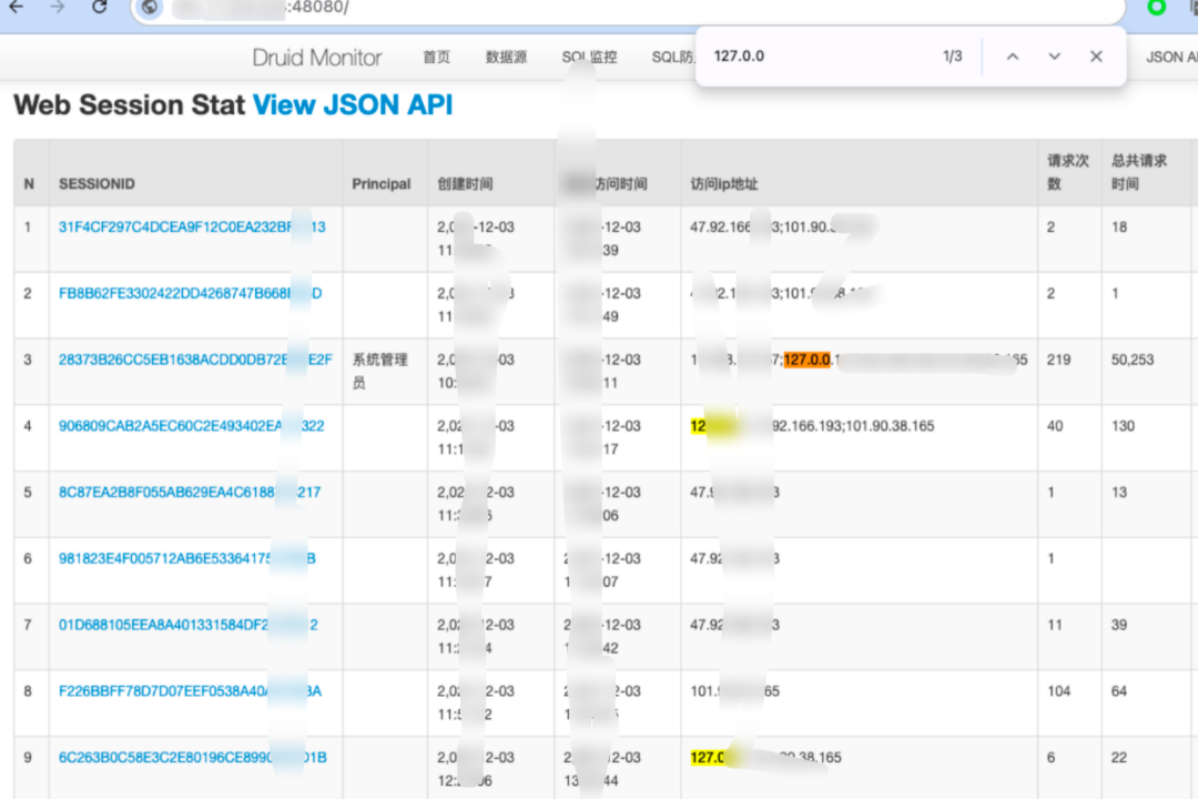 可以看到一堆session,其中包含访问地址为本地地址的管理员session。