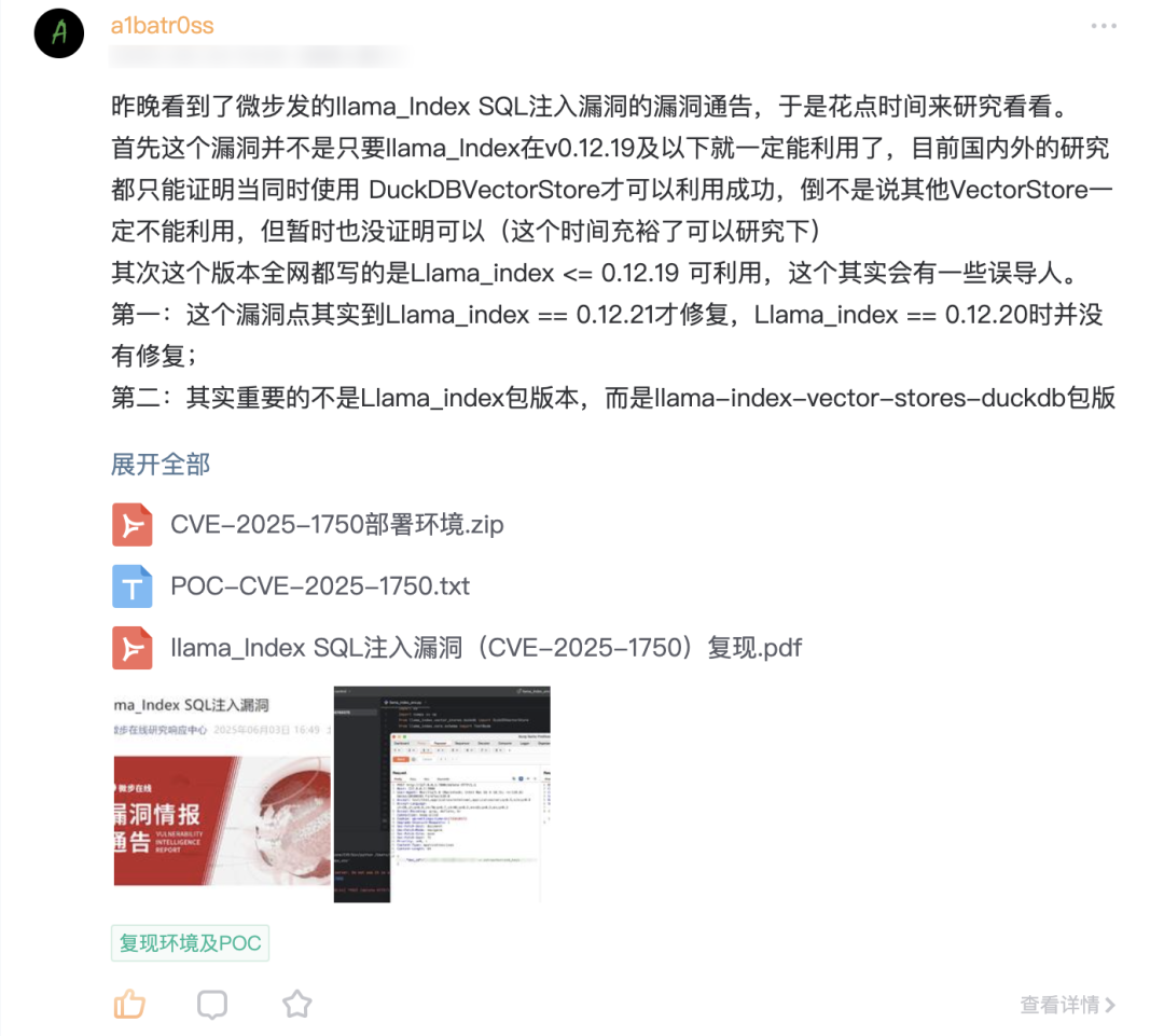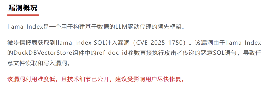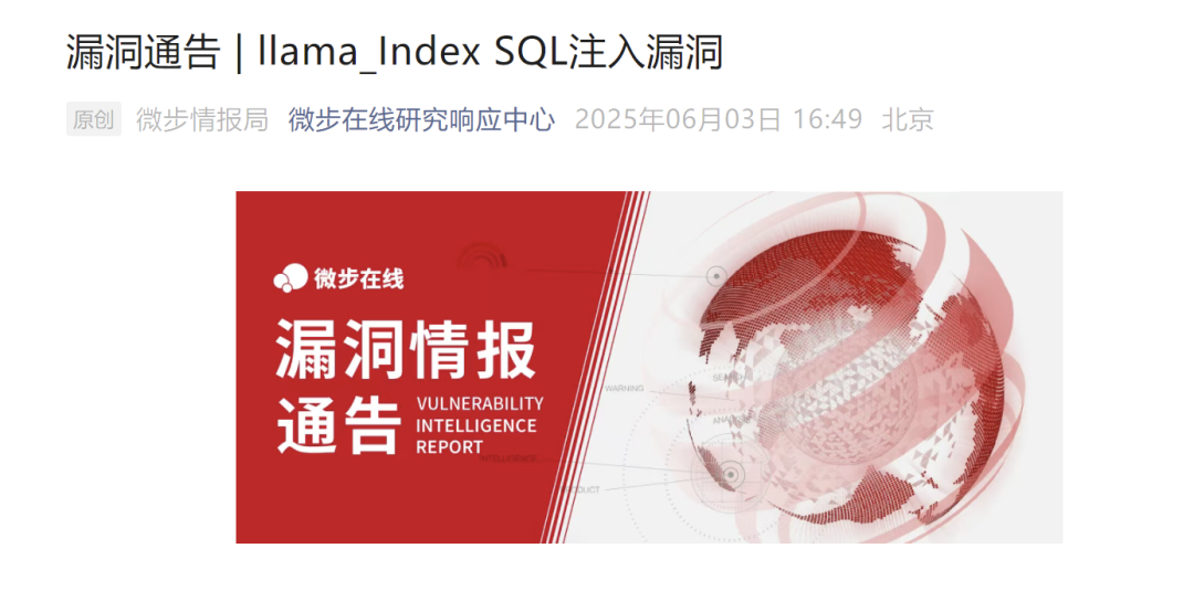 昨天晚上刷到了“微步在线研究响应中心”发布了了一则漏洞通告,通告了一个llama_Index SQL注入漏洞
