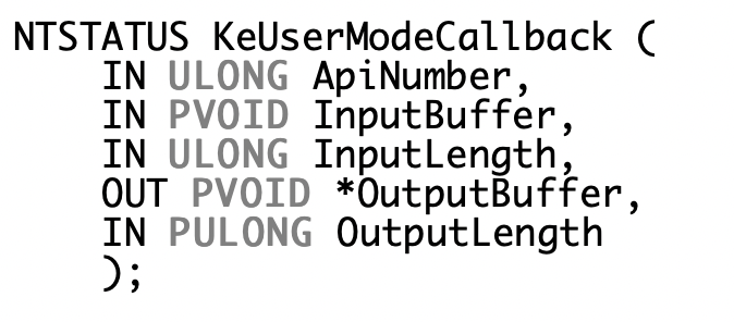 在即将进行的漏洞分析中,我们将展示如何通过KernelCallback表钩住用户模式回调,并展示该表在WinDbg中的样子。KeUserModeCallback的函数原型及其相关参数如下图所示。