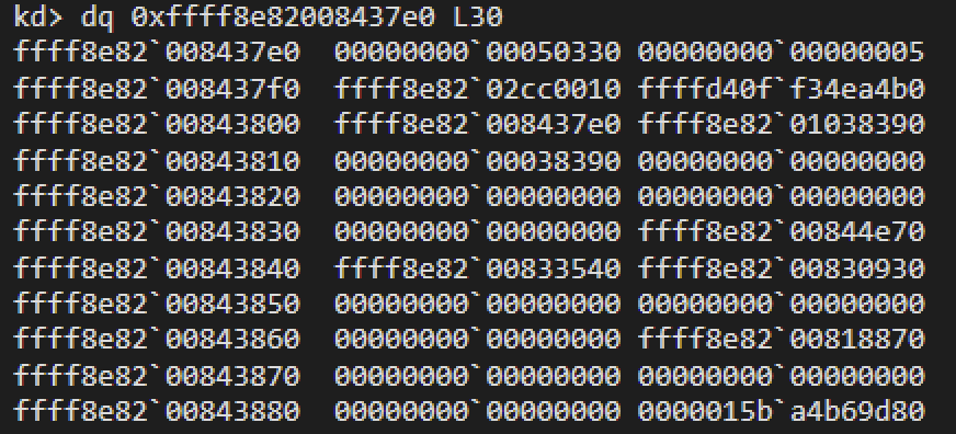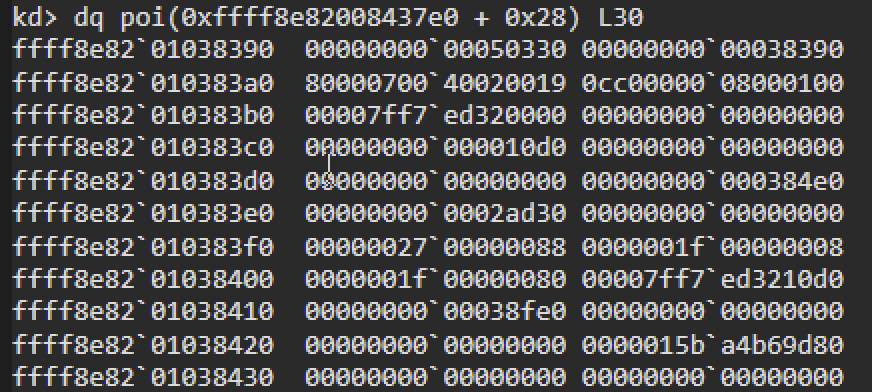 上图是父tagWND,你可以看到句柄(偏移量0x00)与下面的复制tagWND的句柄相同。你还可以看到父结构具有内核地址,而用户模式安全副本仅具有用户模式地址。最后,注意父tagWND+0x28是指向子tagWND副本地址的指针。
