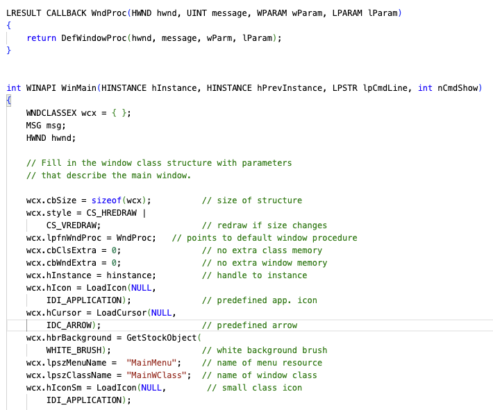如下图所示,示例程序首先定义一个窗口类。进程必须先注册一个窗口类,然后才能创建WNDCLASSEX结构中定义的窗口类型。首先,窗口类对象被声明为WNDCLASSEX wcx ={},然后填充窗口类结构。