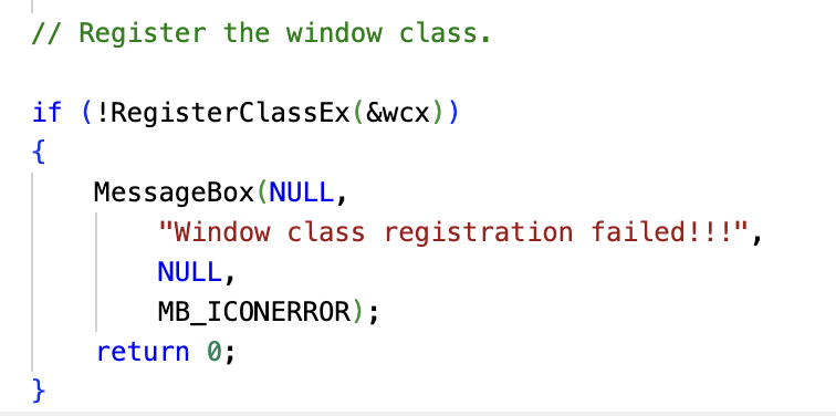 既然窗口类的属性已经定义好了,我们需要使用RegisterClassEx()在应用程序中注册,如下图所示。如果失败,RegisterClassEX()返回0。否则,它返回一个惟一标识所注册类的类原子。注册窗口类将定义该类及其关联的结构成员到Windows。