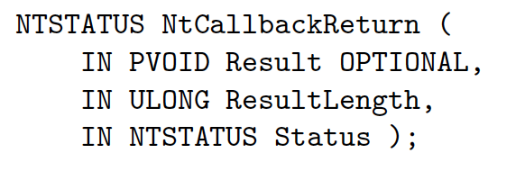 一旦用户模式回调完成,就会调用NtCallbackReturn以恢复内核中的执行。此函数将回调的结果复制回原始内核堆栈,并恢复保存在kernel_stack_CONTROL结构中的trap帧(PreviousTrapFrame)和内核堆栈。在跳转到它先前停止的位置之前(在ntdll!KiCallUserMode中),内核回调堆栈被删除。