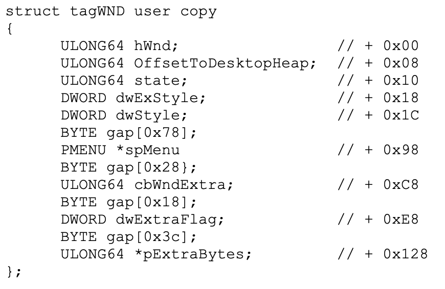 tagWND结构在线程环境块(TEB)的Win32ClientInfo条目中被引用,为了防止内核模式地址泄露,它已被删除了。