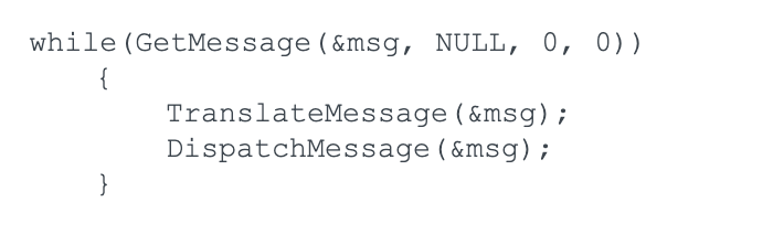 Windows为每个线程维护一个消息队列,该队列将中继任何影响窗口状态的用户输入事件。然后,Windows将这些事件转换为消息,并将它们放入消息队列。应用程序通过执行类似于下面中的代码来处理这些消息。