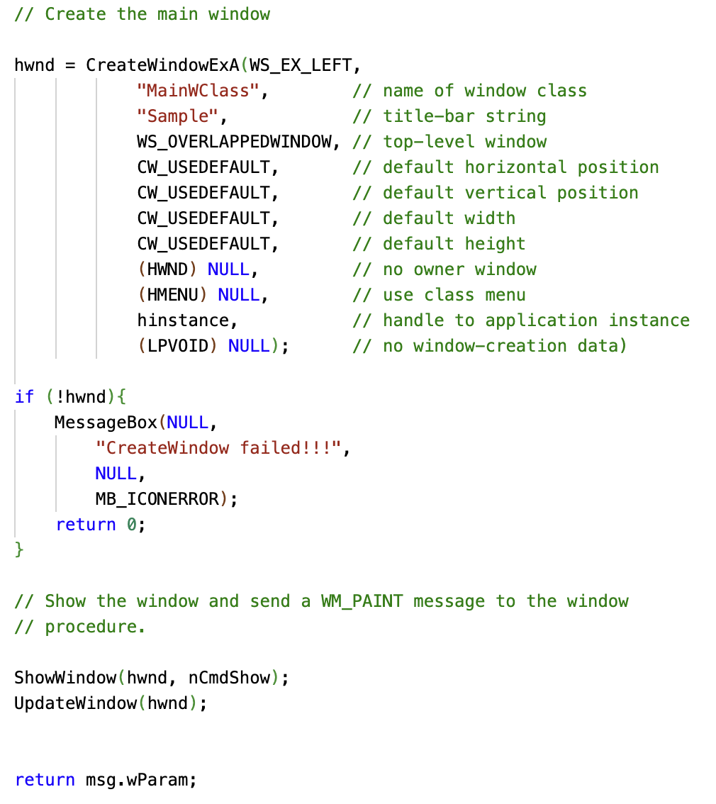 一旦调用CreateWindowEx()创建了窗口,就在内部创建了窗口,也就是说,已经分配了内存并填充了其结构,但没有显示。为了显示窗口,我们调用ShowWindow()函数。