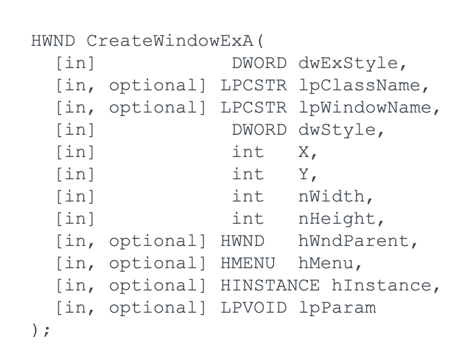 CreateWindowExA函数原型
