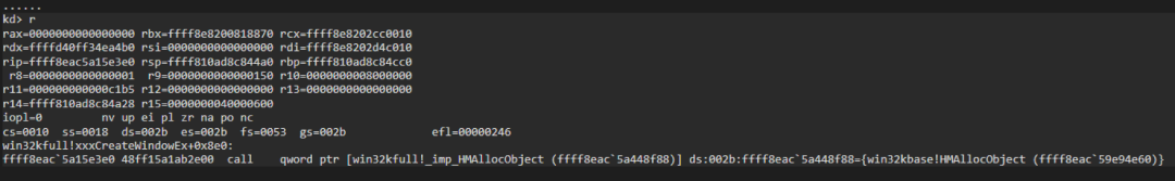 在调用HMAllocObject之前的WinDbg输出如下图所示。你可以看到第四个参数,它表示分配大小,存储在r9寄存器中,等于0x150。