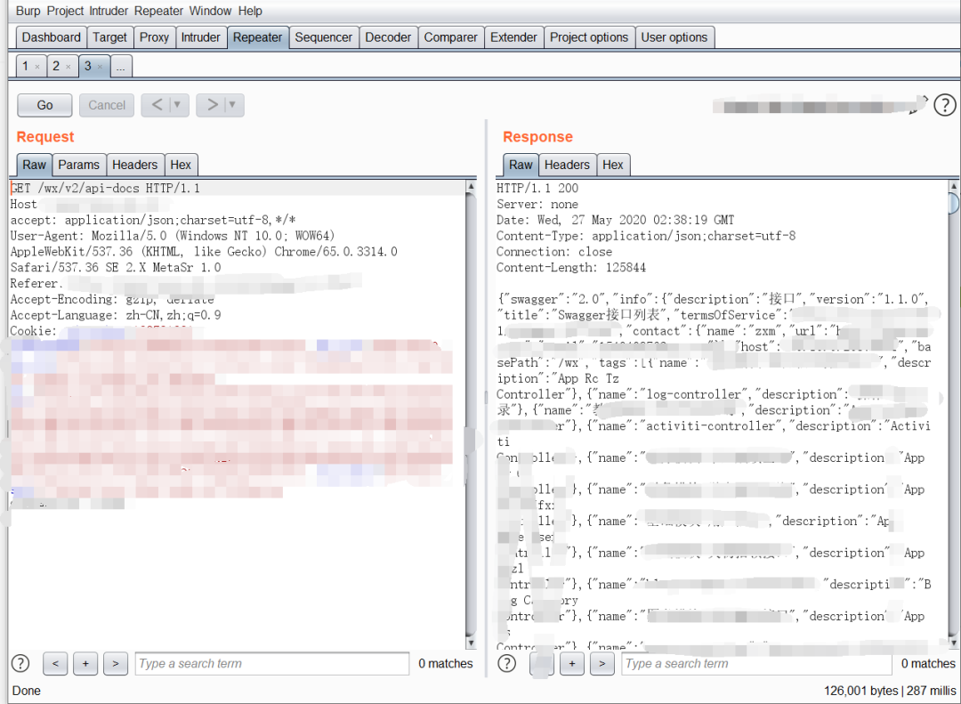 例如:添加swagger-ui.html 可以访问到swagger服务。如果服务端对swagger-ui.html这个页面进行了限制可以通过/v2/api-docs 来获取API